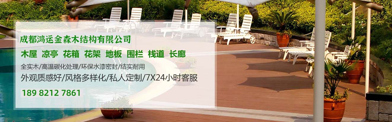 成都鸿运金森木结构工程有限公司是户外凉亭、 防腐木凉亭 、景观葡萄架、长廊、酒柜吧台、户外桌椅、酒吧家俱用品等产品专业生产加工的公司,拥有完整、科学的质量管理体系。
